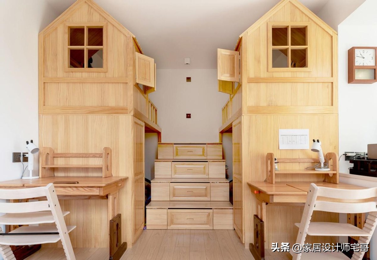 Giường tầng giúp tiết kiệm diện tích, đồng thời tạo không gian riêng cho hai bé sinh đôi. Bàn học được đặt gần cửa sổ để tận dụng ánh sáng tự nhiên, tạo cảm giác thoải mái khi học tập.
