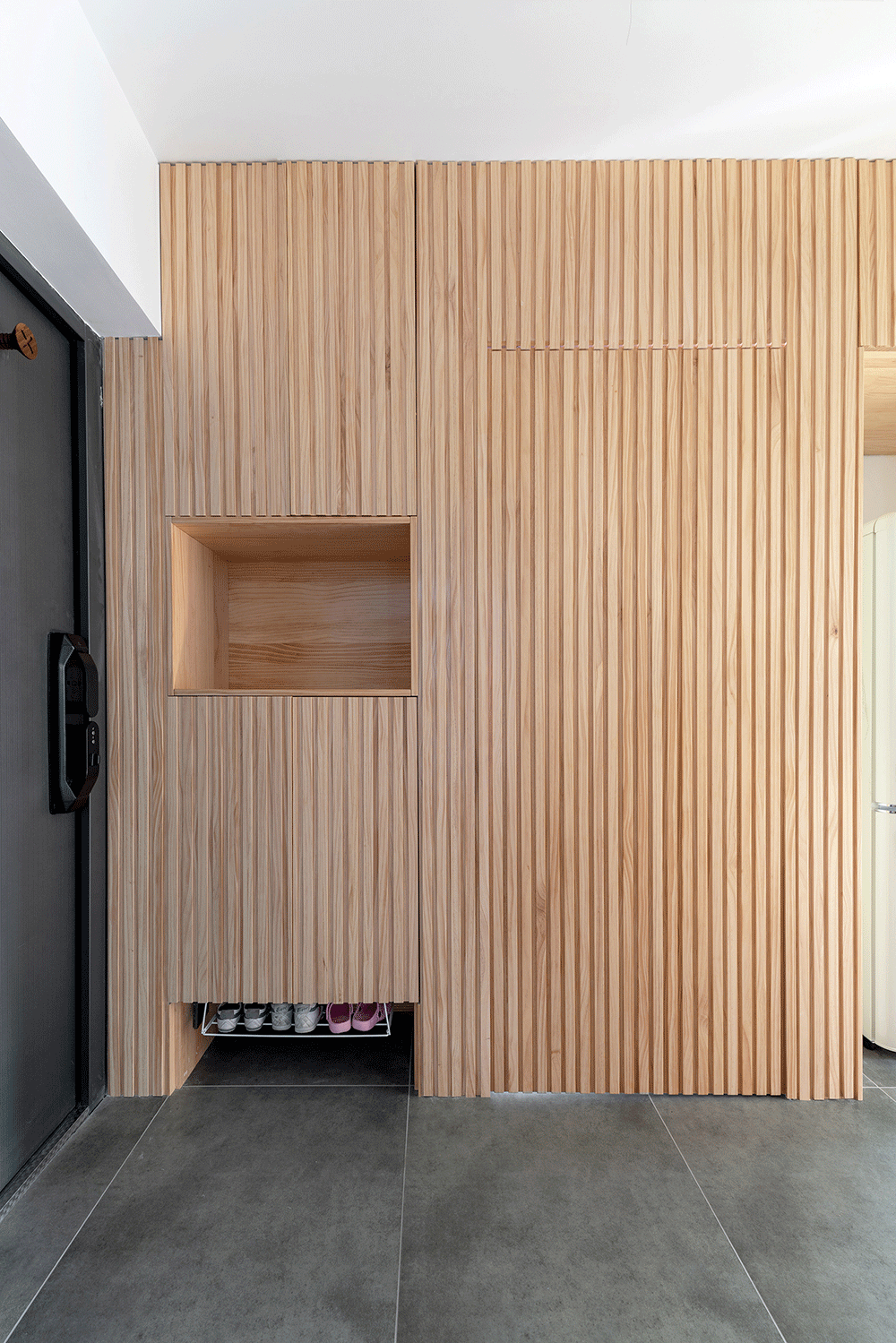 Ngay khu vực cửa ra vào, một tủ giày âm tường được lắp đặt để tăng không gian chứa đồ mà không làm căn hộ trở nên bí bách.