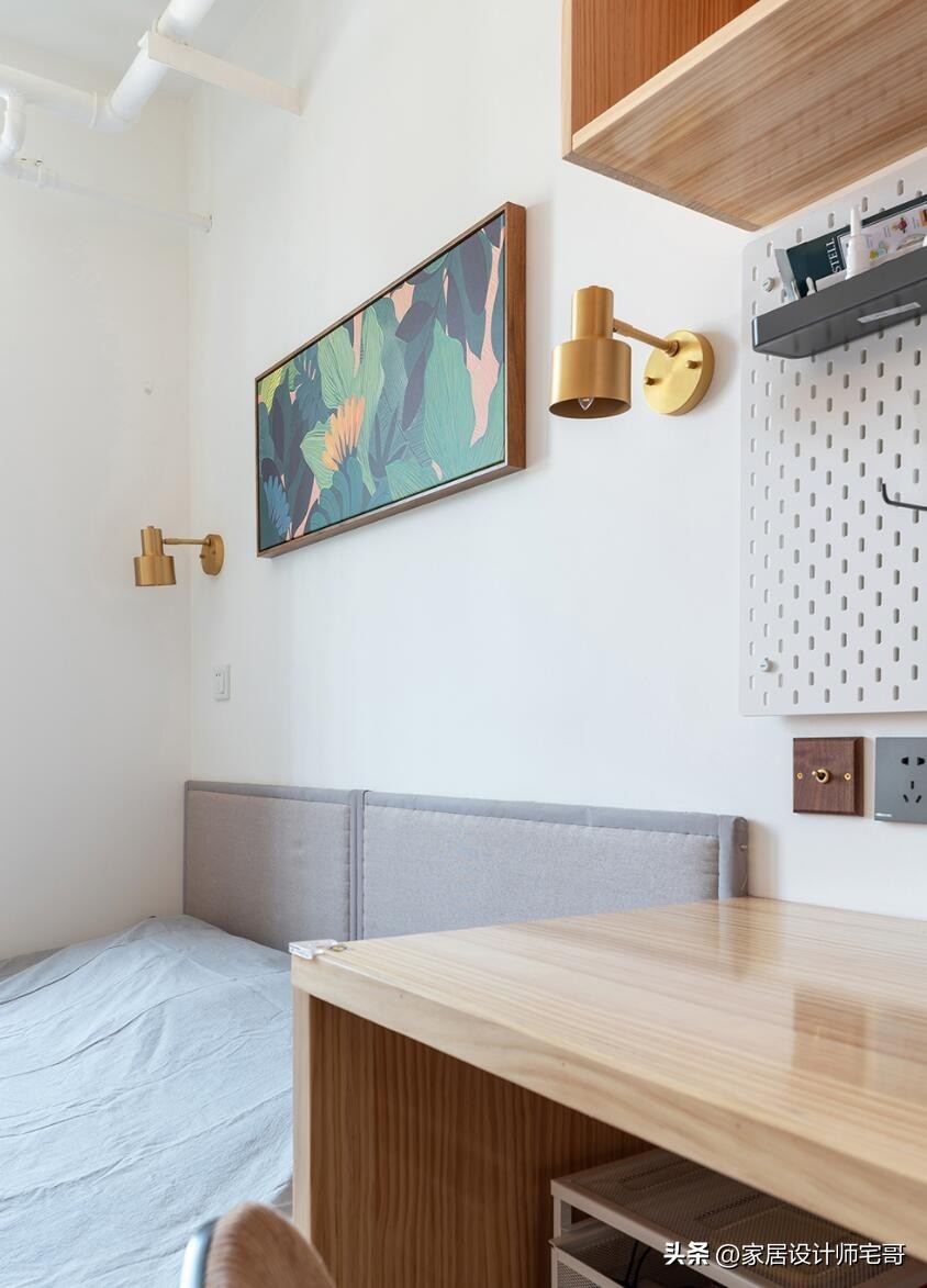 Tường phòng ngủ gần lối vào được điều chỉnh để tạo các hốc tường, giúp bố trí thêm tủ lưu trữ và vị trí đặt tủ lạnh. Cách làm này giúp giải phóng diện tích cho khu bếp nhỏ, tránh cảm giác chật chội.