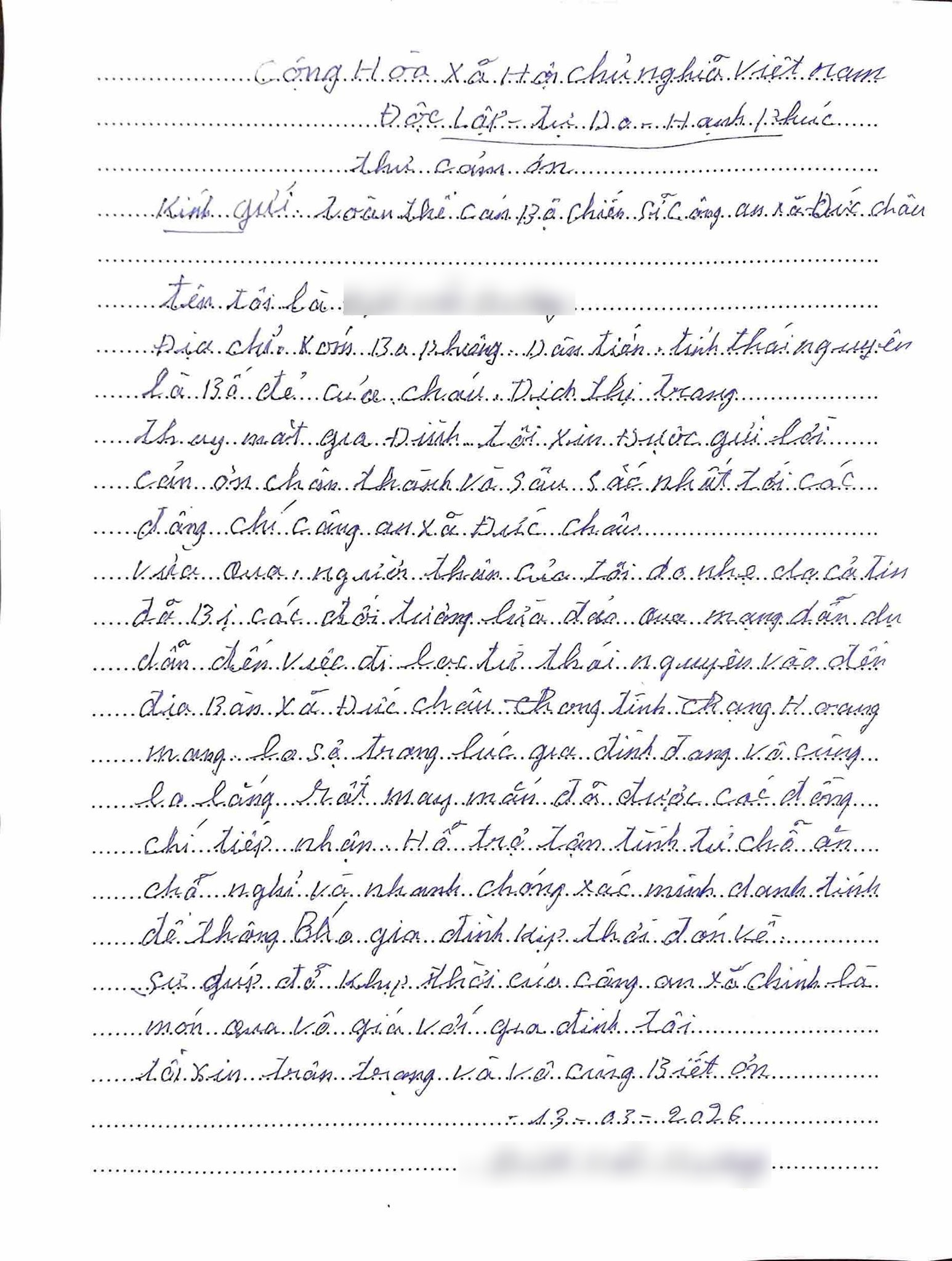 Khi con gái an toàn trở về nhà, ông Đ.V.D (bố chị Tr) viết thư cảm ơn Công an xã Đức Châu. Ông D cho biết, "Con tôi do nhẹ dạ cả tin đã bị các đối tượng lừa đảo qua mạng dẫn dụ đi lạc từ Thái Nguyên vào địa bàn xã Đức Châu trong tình trạng hoang mang. Trong lúc gia đình đang vô cùng lo lắng, rất may mắn con tôi đã được cán bộ công an tiếp nhận, hỗ trợ tận tình".