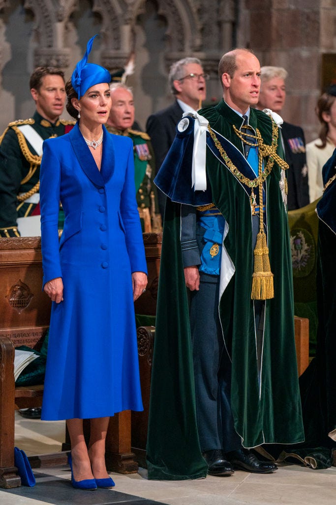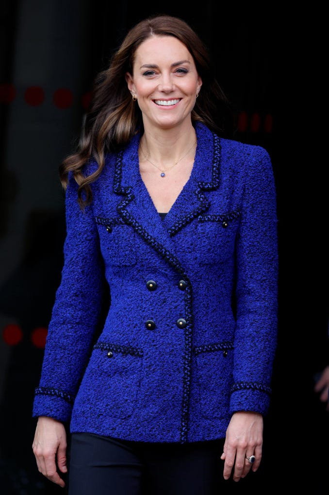 Không chỉ trong lễ đính hôn, xanh hoàng gia còn theo chân các thành viên Vương thất Anh trong mọi khoảnh khắc. Bạn có nhớ sự kiện Ngày Khối thịnh vượng chung 2026? Vương phi Kate đã mix&match đỉnh cao với chiếc áo choàng Catherine Walker, đội mũ ton-sur-ton và cầm chiếc túi Strathberry họa tiết da cá sấu siêu tinh tế. Hay như chuyến công du đến Belize năm 2022, cô diện chiếc váy hoa nhí Tory Burch màu xanh dương đậm chất nhiệt đới, khéo léo dùng thời trang để làm ngoại giao vì màu sắc này trùng khớp với quốc kỳ nước chủ nhà.