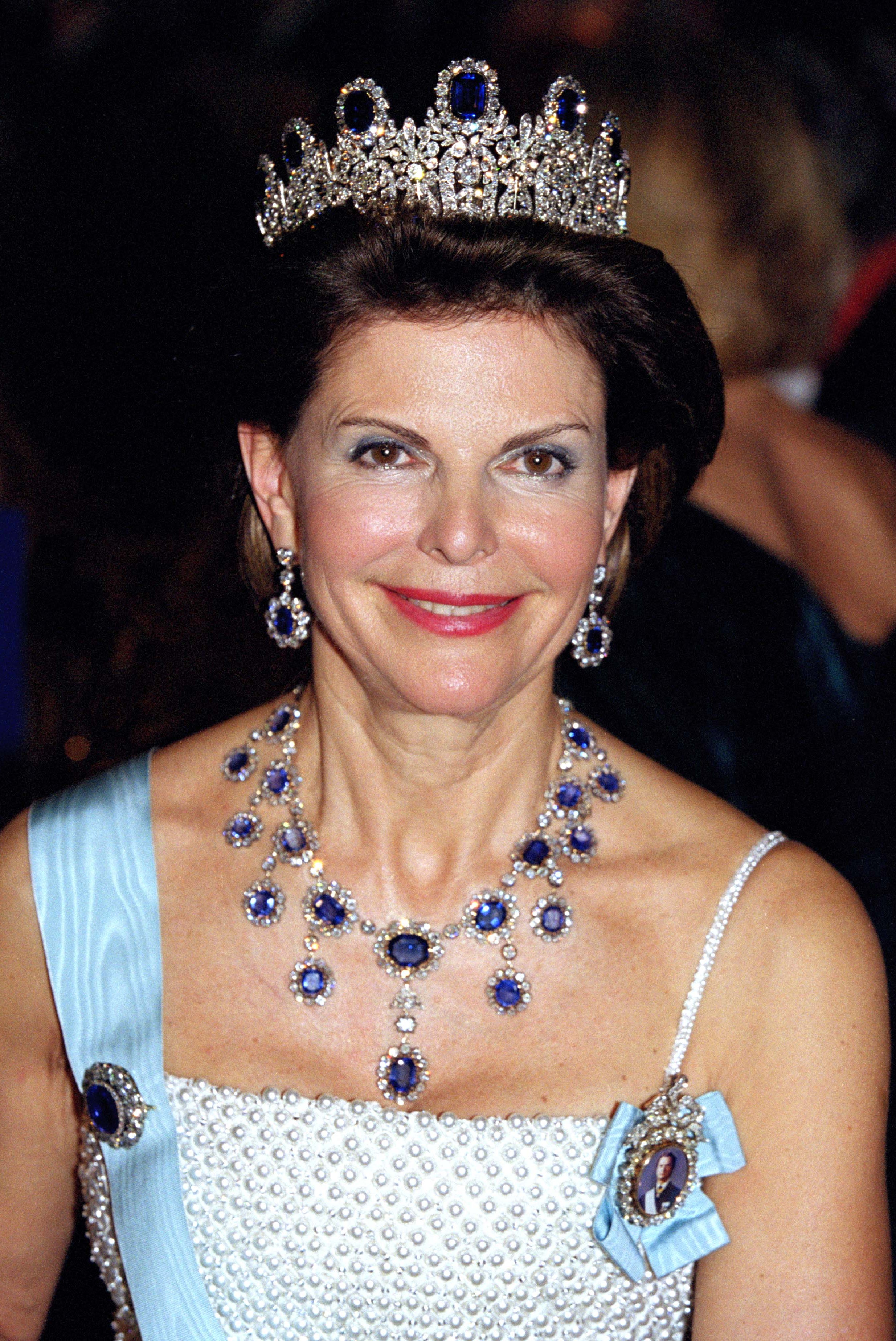 Sức hút của xanh hoàng gia không chỉ dừng lại ở biên giới nước Anh mà còn lan tỏa khắp các cung điện châu Âu. Vương hậu Silvia của Thụy Điển từng khiến cả thế giới lóa mắt tại lễ trao giải Nobel khi diện bộ trang sức Leuchtenberg Sapphire Parure. Đây không phải món đồ mua vội ở tiệm kim hoàn, mà là báu vật có từ thời Napoleon, truyền tay qua bao thế hệ để lọt vào bộ sưu tập của Hoàng gia Thụy Điển. Sự tráng lệ của những viên sapphire kết hợp cùng kim cương rực rỡ trên nền váy dạ hội khiến vẻ đẹp của Vương hậu càng thêm uy nghi, diễm lệ.