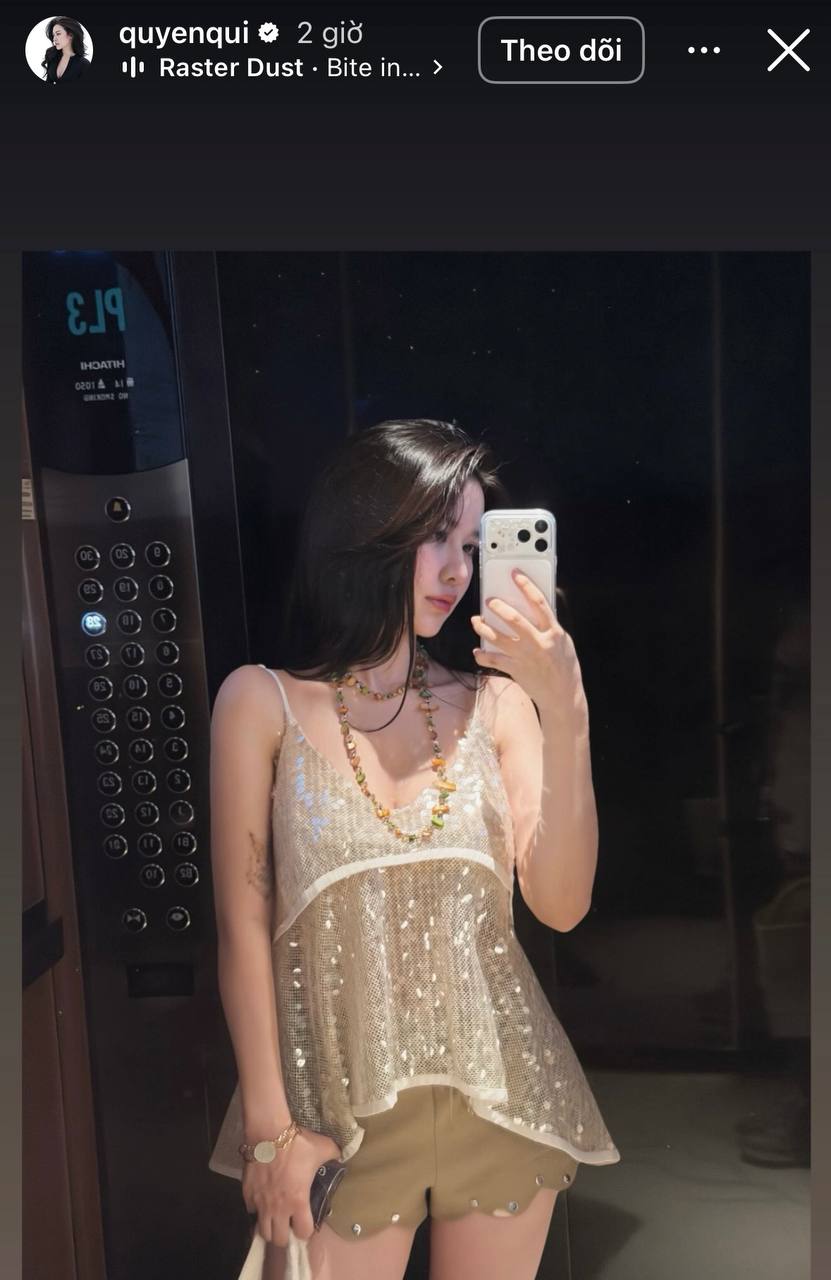 Người đẹp Quyên Qui lên đồ xinh xắn, nhưng cũng không kém phần gợi cảm trong chiếc váy ngắn. Cô nàng check-in ở thang máy khiến nhiều người đoán rằng cô nàng đi hẹn hò. Bởi, gần đây trên MXH cá nhân, Quyên Qui công khai bạn trai mới - phó chủ tịch.