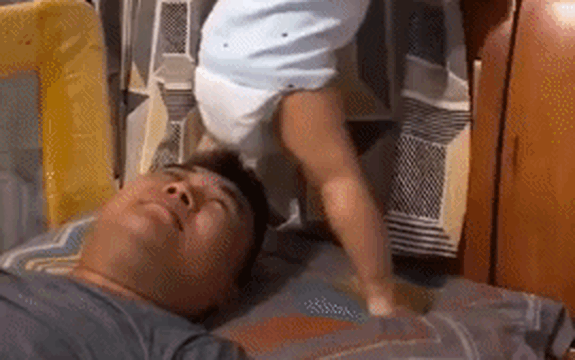 Cụ thể, theo đoạn clip này, ông bố đang nằm lăn ra ngủ chẳng biết trời trăng gì mặc cậu con lon ton ở bên. Ban đầu, ông ễnh con này mon men bám vào thành giường rồi giơ một chân, đặt nguyên lên mặt bố. Thế mà bố cũng lì lắm, gạt ra rồi tiếp tục ngủ tiếp.