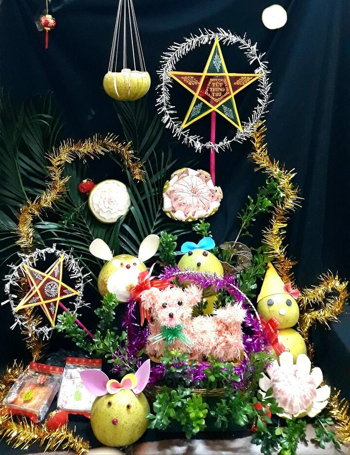 Mâm cỗ Trung Thu đơn giản hơn với chó bưởi, các loại trái cây được cắt tỉa hình thú. (Ảnh: Thu Huong Vu)