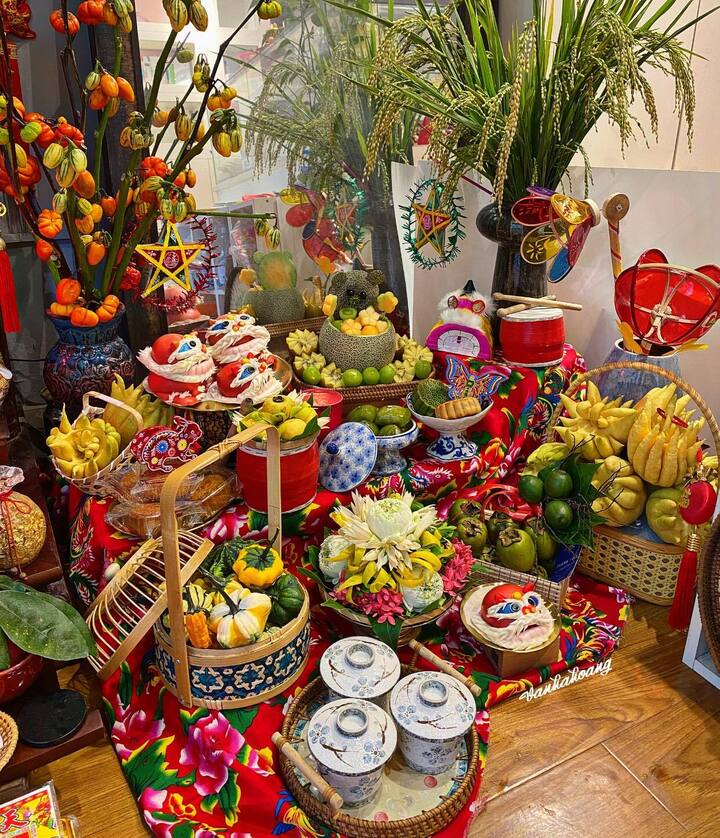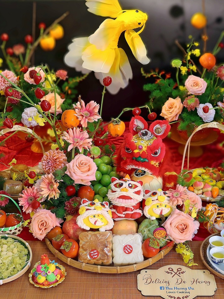 Mâm cỗ rực rỡ với hoa tươi, trái cây ngọt lành, bánh nướng, bánh dẻo đủ vị và những chú đầu lân nhỏ xinh, tượng trưng cho sự đoàn viên, ấm no. Bên cạnh là mâm quả ngũ sắc, đèn cá chép vàng bay bổng, tất cả hòa quyện tạo nên một không khí Trung thu sum vầy, rộn ràng. (Ảnh: Thu Huong Vu)