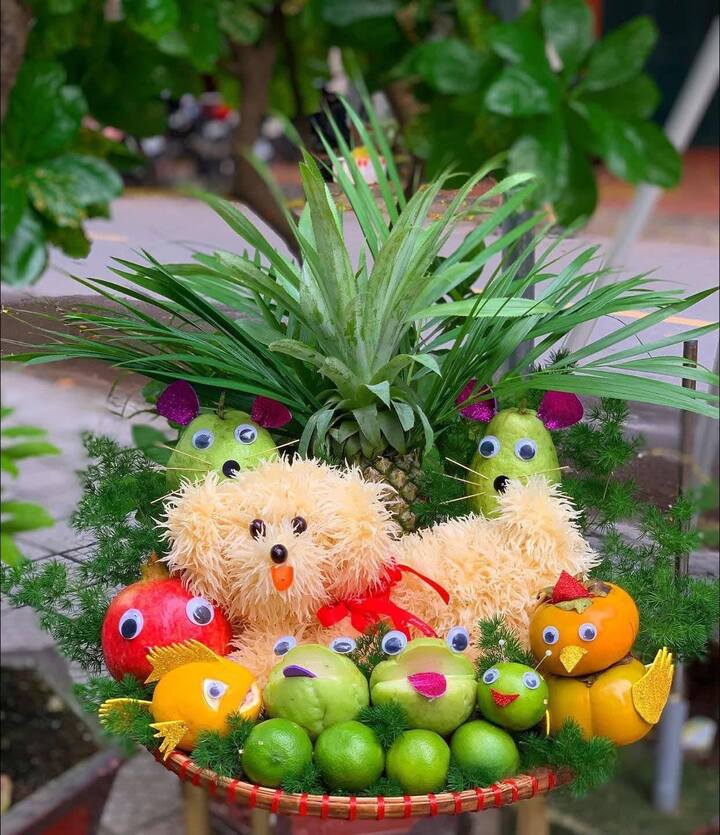 Mâm cỗ Trung thu trở nên sống động hơn nhờ những loại trái cây được cắt tỉa cầu kỳ, khéo léo tạo thành đủ hình thù ngộ nghĩnh như chú chó bằng quả bưởi, chú gấu đáng yêu kết bằng chùm nho. Sự sáng tạo ấy không chỉ khiến mâm cỗ thêm rực rỡ, bắt mắt mà còn mang lại niềm vui, sự háo hức cho các em nhỏ trong đêm trăng rằm. (Ảnh: Phạm Thu Huyền)