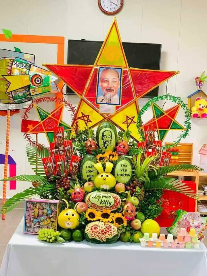 Mâm cỗ Trung thu được các cô giáo chuẩn bị tại lớp học, với điểm nhấn là quả dưa hấu khắc chân dung Bác Hồ đầy thân thương mà trang trọng, kết hợp cùng nhiều loại trái cây khác. (Ảnh: Thu Huong Vu)