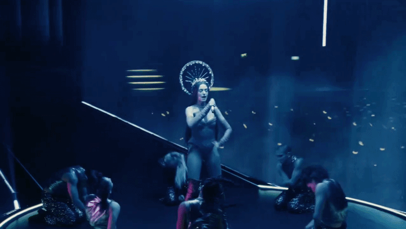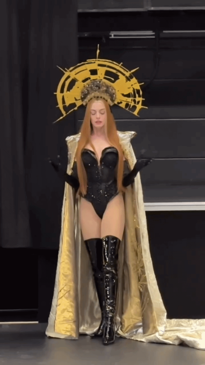 Anne Hathaway gây ấn tượng ngay từ đầu đoạn trailer với giao diện sắc sảo. Cô diện một thiết kế bodysuit ôm sát, với phần dây mảnh và đường cắt gọn gàng, giúp tôn lên bờ vai thanh mảnh cùng tấm lưng trần gợi cảm. Chất liệu tối màu kết hợp với ánh sáng sân khấu tạo hiệu ứng thị giác mạnh, khiến từng đường nét cơ thể trở nên nổi bật hơn. Đáng chú ý, phần quần được thiết kế cắt xẻ sâu, tôn lên vòng 3 gợi cảm của nữ minh tinh. Với set đồ ôm sát, Anne Hathaway cũng khiến nhiều người trầm trồ với body tuổi 44 săn chắc, cân đối cùng vòng eo thon gọn và đường cong rõ rệt, cho thấy sự kỷ luật trong việc giữ gìn hình thể.