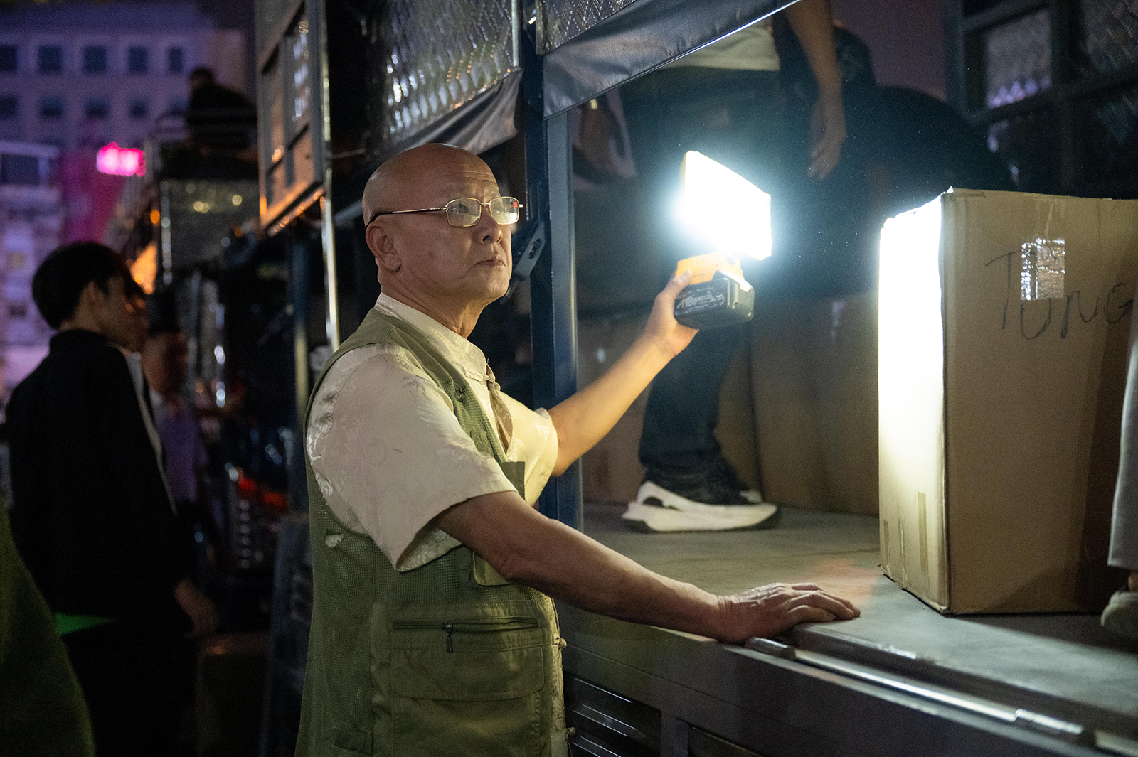 Có cụ ông ngoài 70 tuổi vẫn kiên trì đứng rọi đèn cho đội bốc vác hàng từ thiện, lặng lẽ chiếu sáng từng lối đi và chỗ khuân vác, chỉ nói giản dị: “Nếu sức còn thì tôi còn cố giúp.”