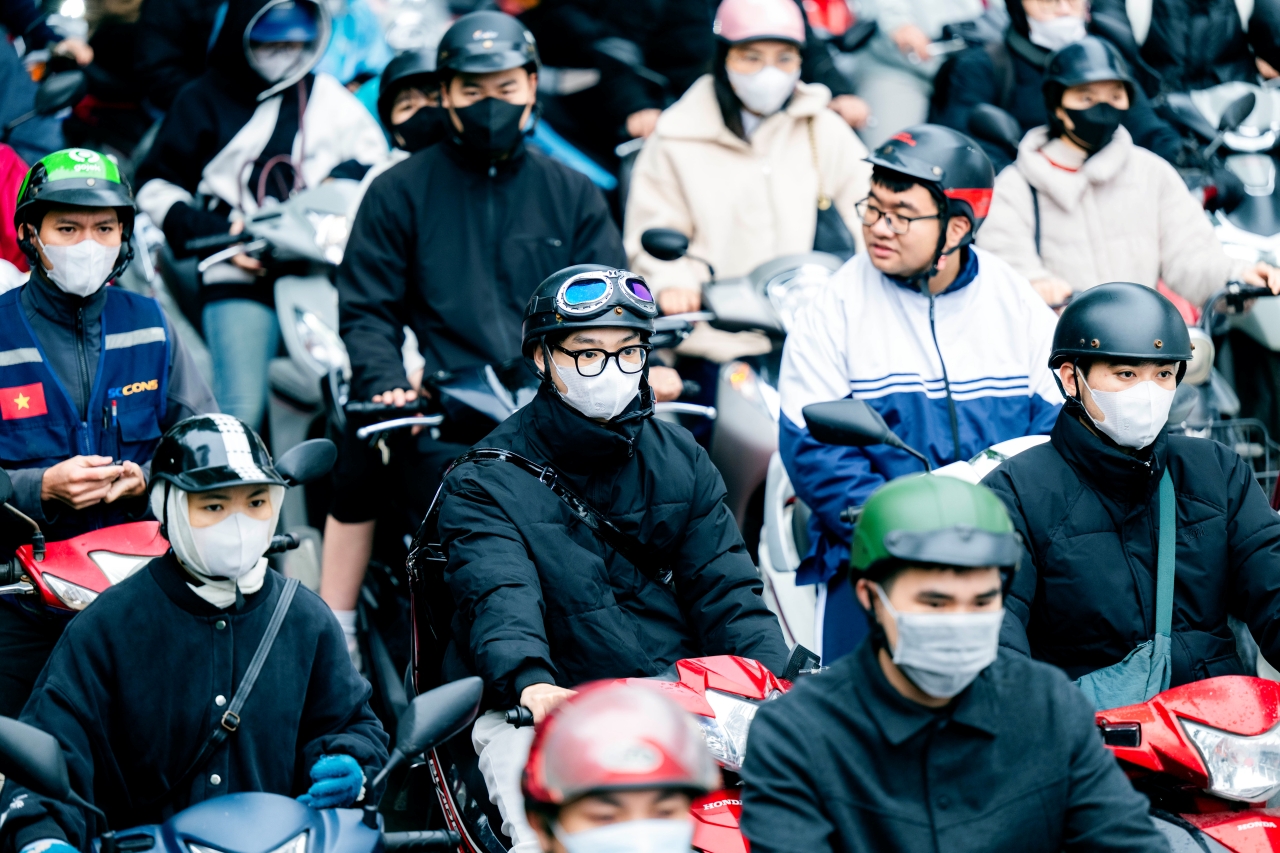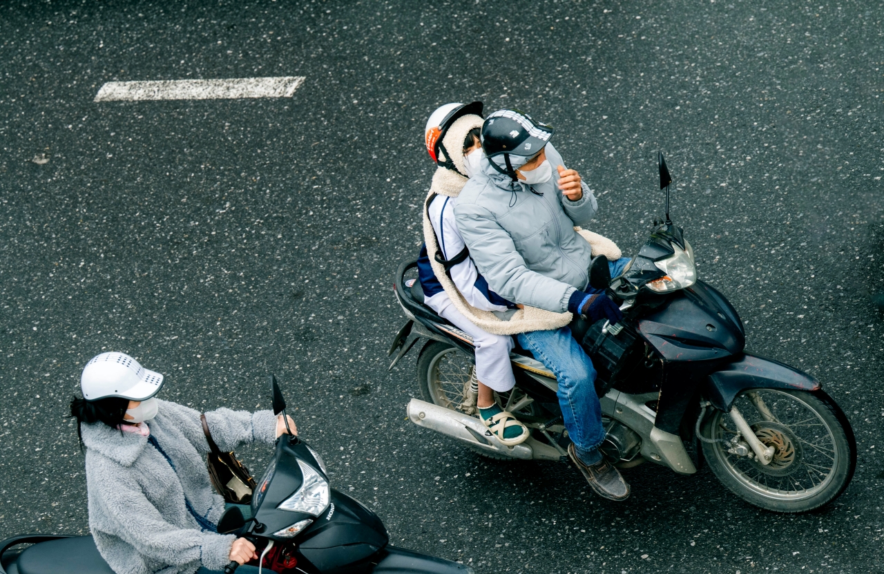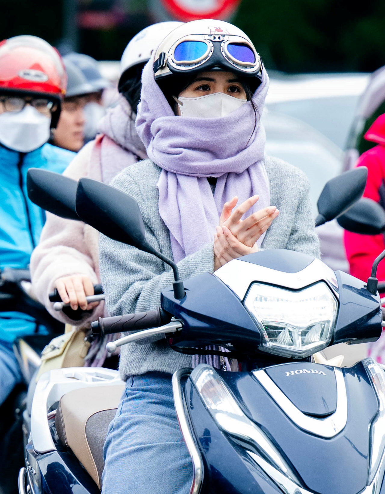 Nhiều người ra đường chuẩn bị đủ “đồ nghề” chống rét như áo phao dày, khăn len quấn kín cổ, găng tay, mũ len… để tránh gió lùa. Trong dòng người hối hả đầu giờ sáng, dân công sở vội vã phóng xe đến cơ quan, không ít người vừa dừng đèn đỏ vừa kéo lại khăn, chỉnh lại áo khoác cho kín, tránh gió lùa.