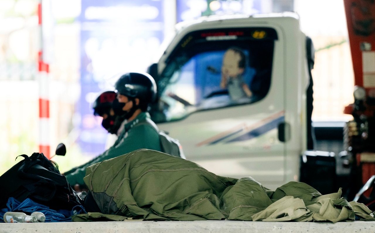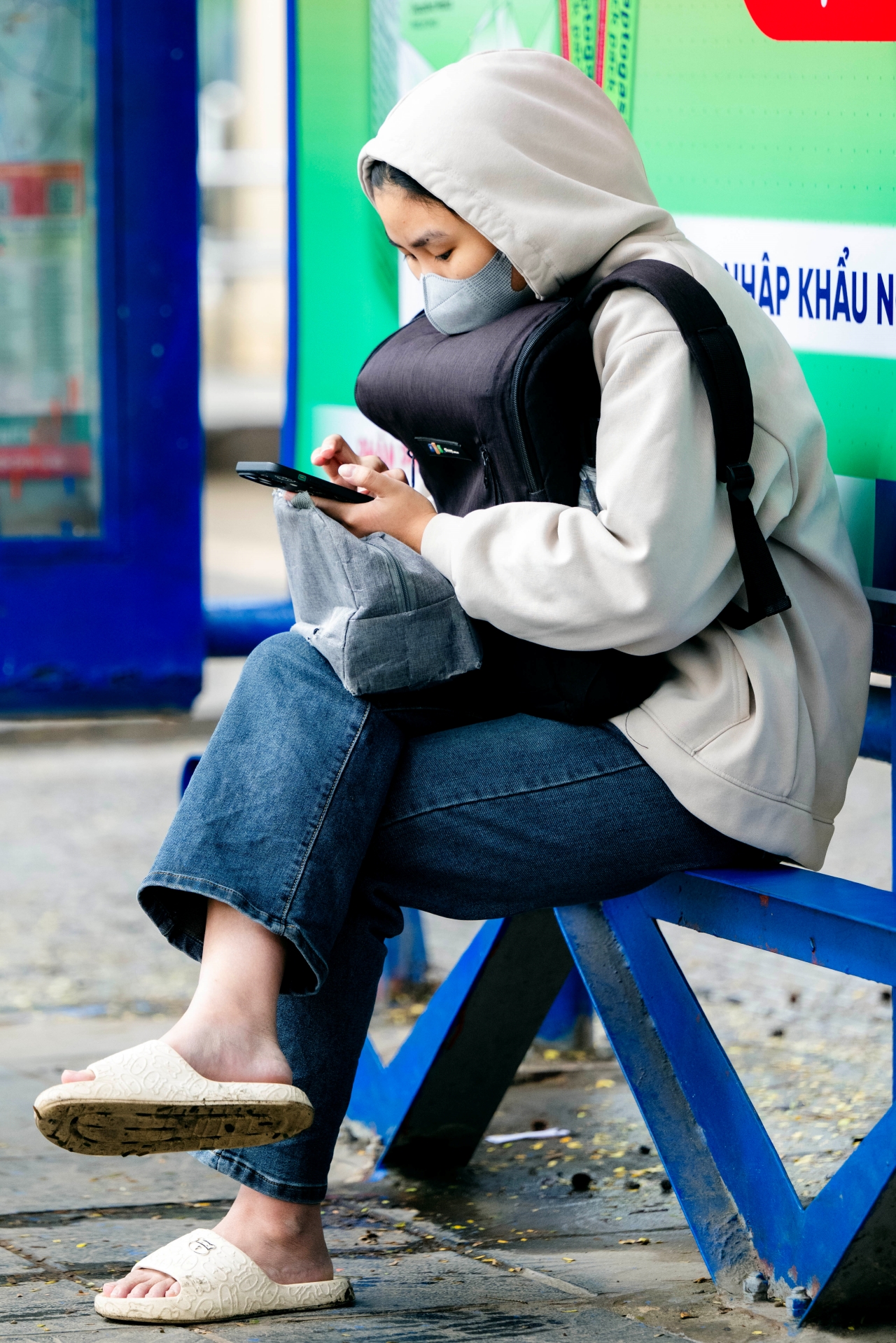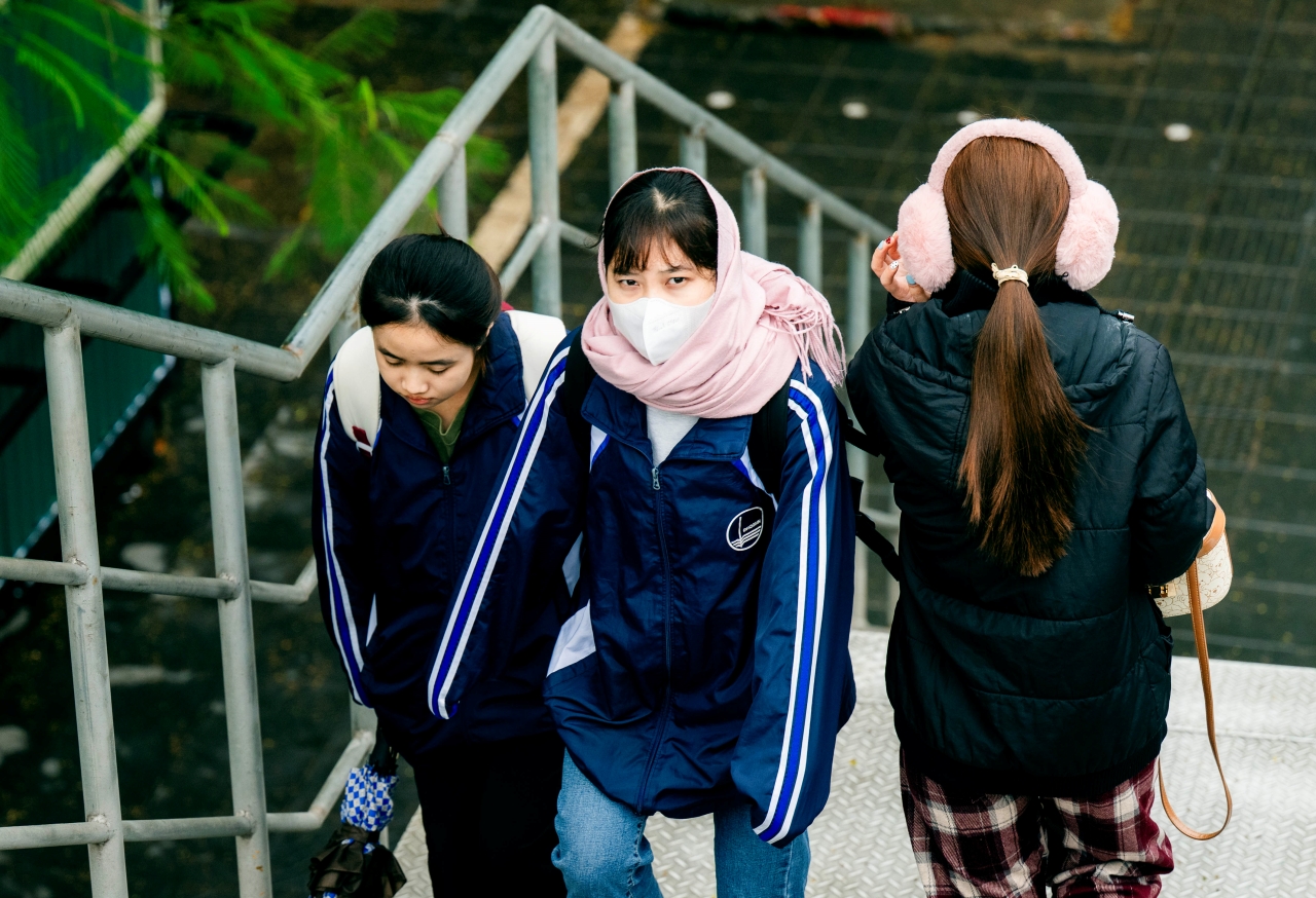 Sinh viên ngồi chờ xe buýt, co ro ôm balo giữa làn gió lạnh đầu mùa
