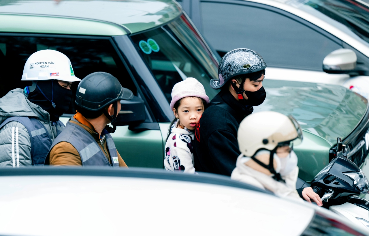 Nhiều em nhỏ cũng được cha mẹ trang bị khăn áo kín mít trên đường đưa đến trường vào buổi sáng