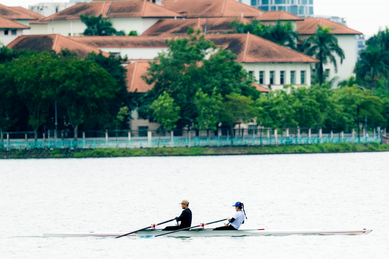 Thời tiết lạnh giá nhưng vẫn có người đi cheo thuyền ở Hồ Tây vào sáng sớm