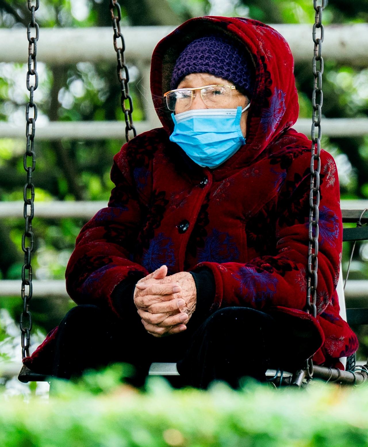 Một bà cụ mặc áo ấm đội khăn lên ngồi bên ghế tận hưởng cái lạnh đầu đông