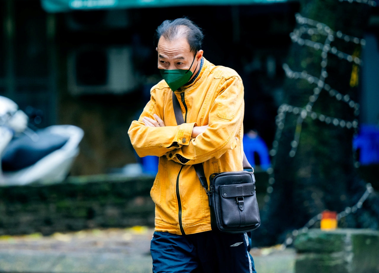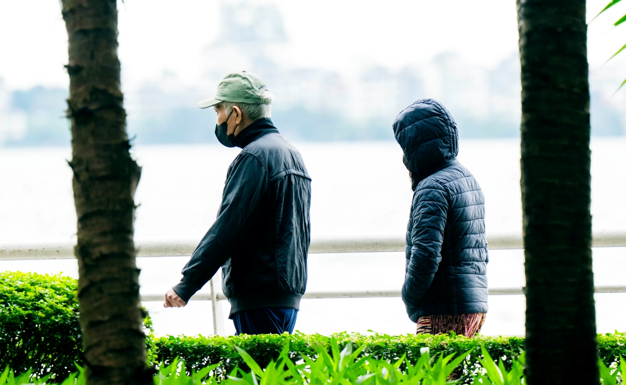 Một góc phố Hà Nội những ngày lánh giá, người đi bộ cúi mình né gió, bước nhanh trong tiết trời se sắt.