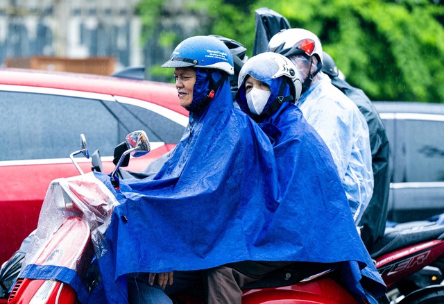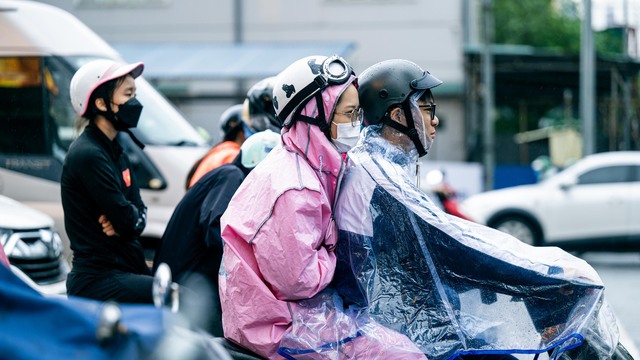 Trên các tuyến đường, người dân đi làm, đi học co ro trong những lớp áo dày, đội mũ, trùm áo mưa để chống chọi mưa lạnh