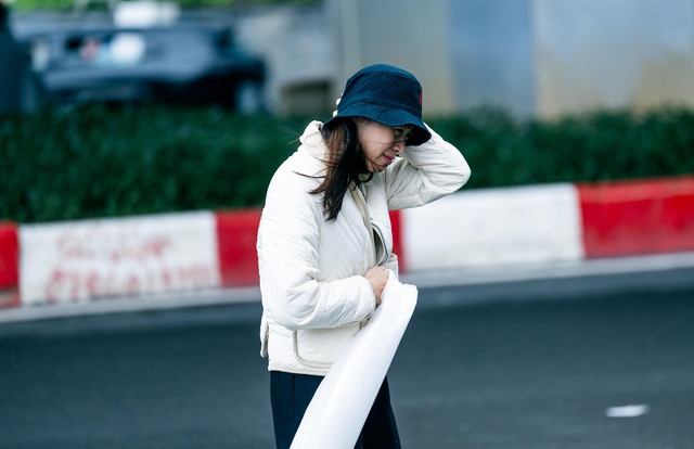 Một cô gái kéo áo kín cổ, dùng tay giữ mũ trong lúc đi bộ để không bị gió thổi bay