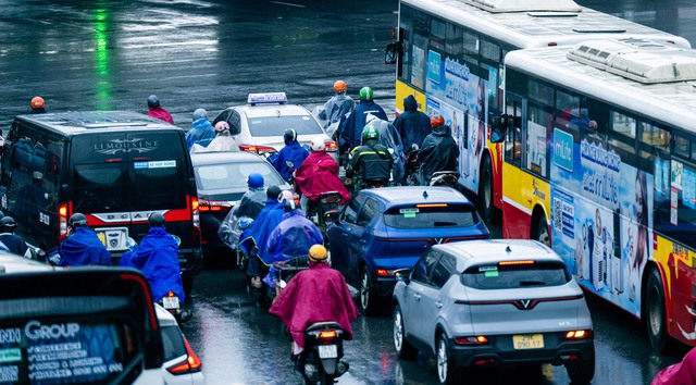 Trời mưa rả rích kéo dài vào khung giờ cao điểm buổi sáng khiến nhiều tuyến đường xảy ra tình trạng ùn tắc