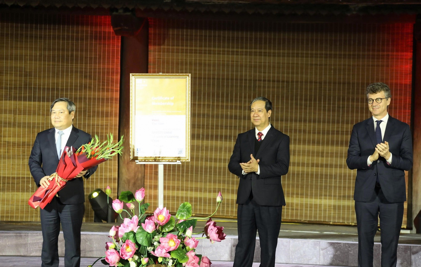 Phó Bí thư Thành ủy, Chủ tịch UBND thành phố Hà Nội Vũ Đại Thắng đón nhận chứng nhận danh hiệu thành phố Hà Nội là thành viên Mạng lưới “Thành phố học tập toàn cầu” của UNESCO.