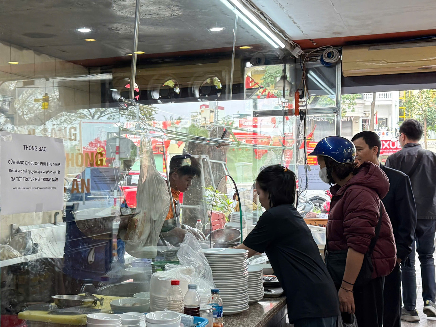 Các quán phở, bún ốc, bún riêu đặc biệt đông khách. Trong sáng mùng 4, khách xếp hàng chờ bàn, mua bán về tại một quán phở ở Hồ Đắc Di (Hà Nội). Quán thông báo phụ thu 10.000 đồng/ bát trong dịp Tết vẫn rất đắt khách.