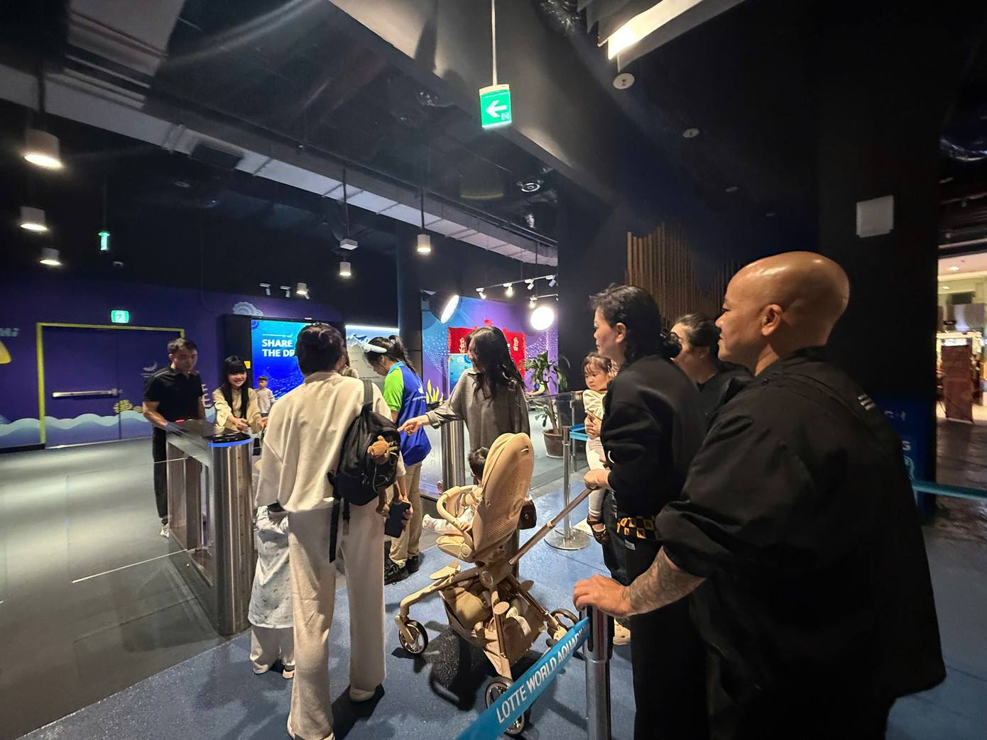 Các gia đình cùng em nhỏ xếp hàng mua vé, chờ vào khu vui chơi.
