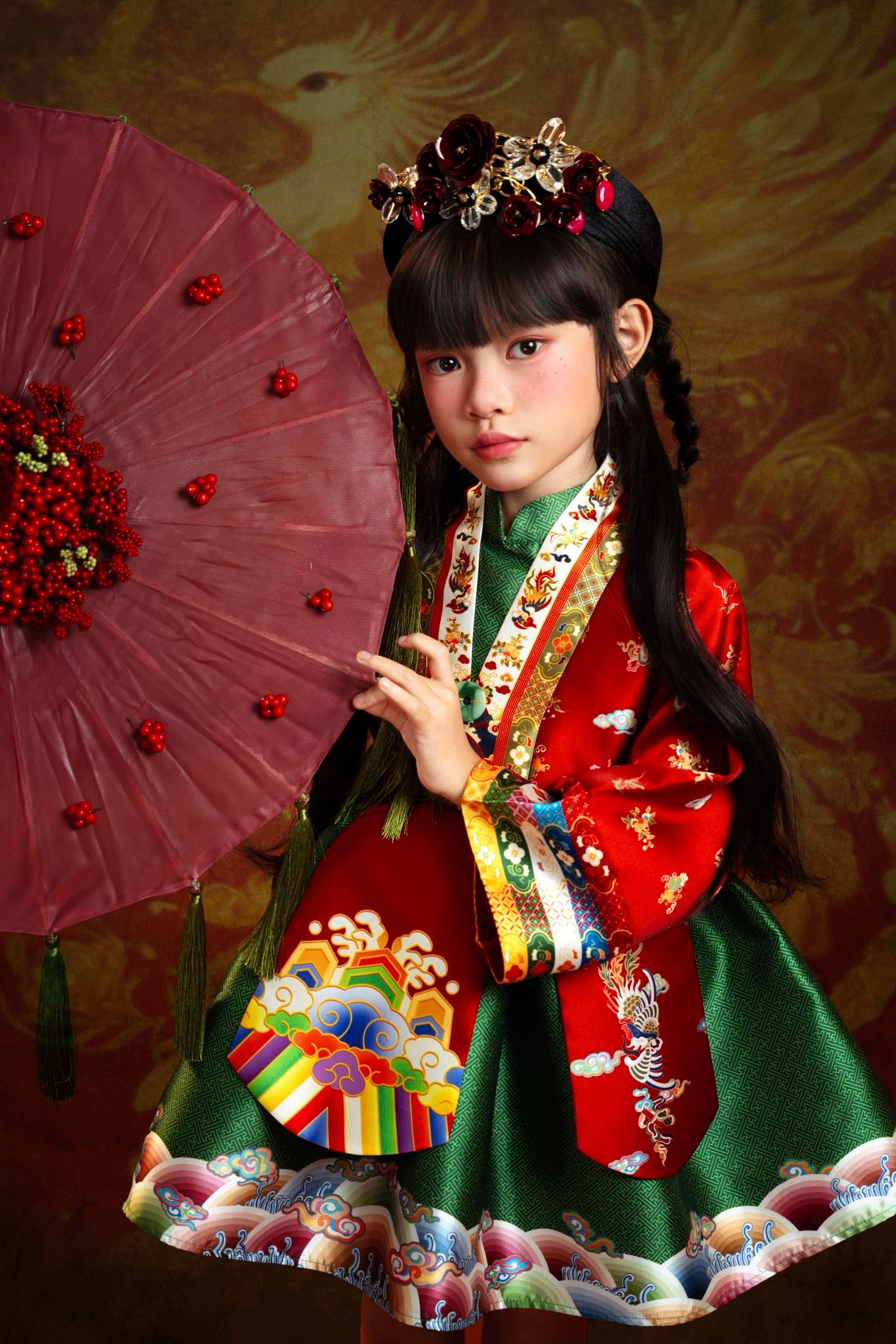 Có mẹ là hoa hậu có khác, bé Ti diện toàn mẫu váy ấn tượng, và mẫu nào cũng tạo nên cơn sốt. Mẫu váy đỏ này, sau khi được ái nữ của HH Đỗ Mỹ Linh diện Tết, ngay lập tức trở thành "mục tiêu" săn lùng của các bố mẹ. Được biết bộ váy này là Y Long của thương hiệu BÉ CÚP BÔNG có giá khoảng 1,1 triệu đồng, với họa tiết thêu hình rồng và đám mây cầu kỳ, chất liệu cao cấp và kiểu dáng đậm chất truyền thống nhưng vẫn hiện đại.