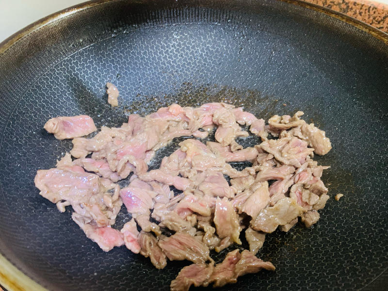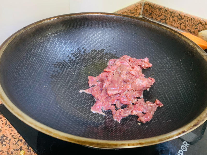 Bước 2: Cho một ít dầu thực vật vào nồi, khi dầu nóng, cho gừng thái lát vào xào thơm. Sau đó cho thịt bò đã ướp vào, đảo nhanh trên lửa lớn cho đến khi thịt bò đổi màu. Lấy thịt ra khỏi nồi ngay lập tức và để riêng (không nên nấu quá chín, nếu không thịt sẽ bị dai và không ngon).