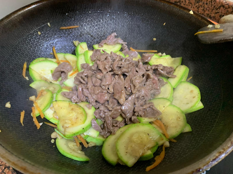 Bước 3: Không cần cho dầu vào chảo. Cho trực tiếp các lát bí ngòi vào và xào trên lửa nhỏ trong 2 phút, cho đến khi bí ngòi mềm nhẹ. Cho thịt bò đã xào trở lại chảo, thêm 1 muỗng canh nước tương, đảo đều để mỗi miếng thịt được phủ đều gia vị, thêm chút muối cho vừa ăn, đảo thêm một phút nữa là xong.