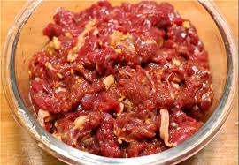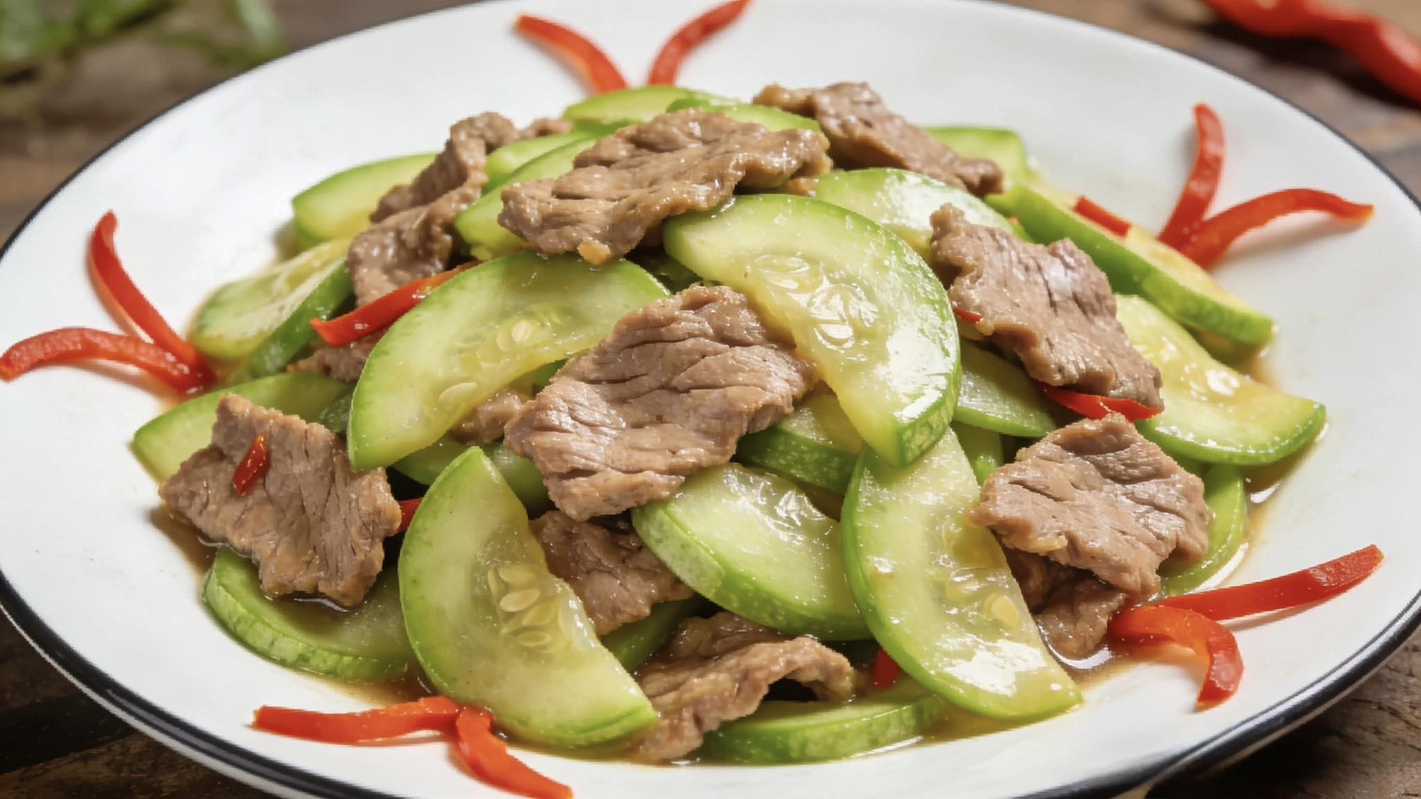 Nguyên liệu: 1 quả bí ngòi, 200g thịt thăn bò, 1 lát gừng, 1 muỗng canh nước tương, 1 muỗng cà phê bột bắp và 1 muỗng canh rượu nấu ăn.