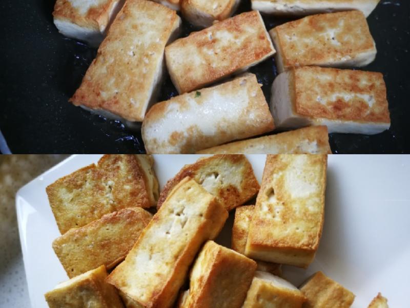Bước 2: Cho một ít dầu oliu vào trong chảo (dùng ít dầu hơn nếu bạn muốn kiểm soát lượng đường). Khi dầu nóng, cho gừng và gốc hành thái lát vào xào thơm. Sau đó cho đậu phụ cắt miếng vuông vào chiên trên lửa nhỏ cho đến khi cả hai mặt hơi vàng nâu.