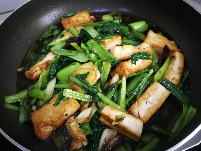 Nguyên liệu: 1 khối đậu phụ (khoảng 300g), 200g rau cải thìa, 2 lát gừng và một ít hành lá thái nhỏ, một chút dầu oliu.