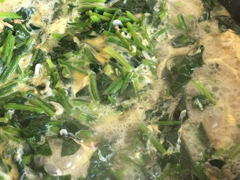 Bước 2: Đun sôi nước trong một nồi khác rồi cho tôm khô vào. Khi nước sôi trở lại thì hạ nhỏ lửa rồi từ từ đổ trứng vào. Để trứng tạo hoa vân đẹp mắt bạn hãy khuấy tròn nồi nước trước khi cho trứng vào. Cuối cùng, cho rau bina đã chần vào, nêm muối, tinh chất cốt gà và một ít dầu mè.