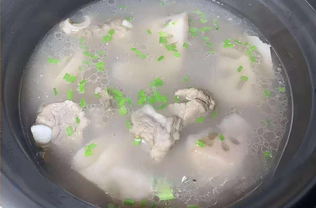 Bước 2: Cho sườn heo và củ sen vào nồi, thêm lượng nước vừa đủ. Thêm 3 lát gừng, đun sôi ở lửa lớn, sau đó chỉnh về mức lửa nhỏ và nấu trong khoảng 45-60 phút. Cuối cùng, thêm gia vị, tinh chất cốt gà cho vừa ăn và rắc hành lá cắt nhỏ lên trên.