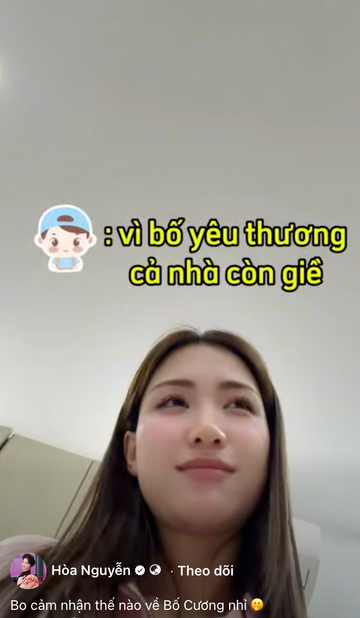 Có lẽ cũng chính vì vậy mà đoạn hội thoại giữa hai mẹ con Hòa Minzy và bé Bo được chia sẻ khiến ai xem cũng không kìm được xúc động. Trong đoạn video được nữ ca sĩ quay lén, cô nhẹ nhàng hỏi con trai một câu tưởng chừng rất đơn giản: "Mẹ hỏi thật, con thấy bố Cương thế nào?".