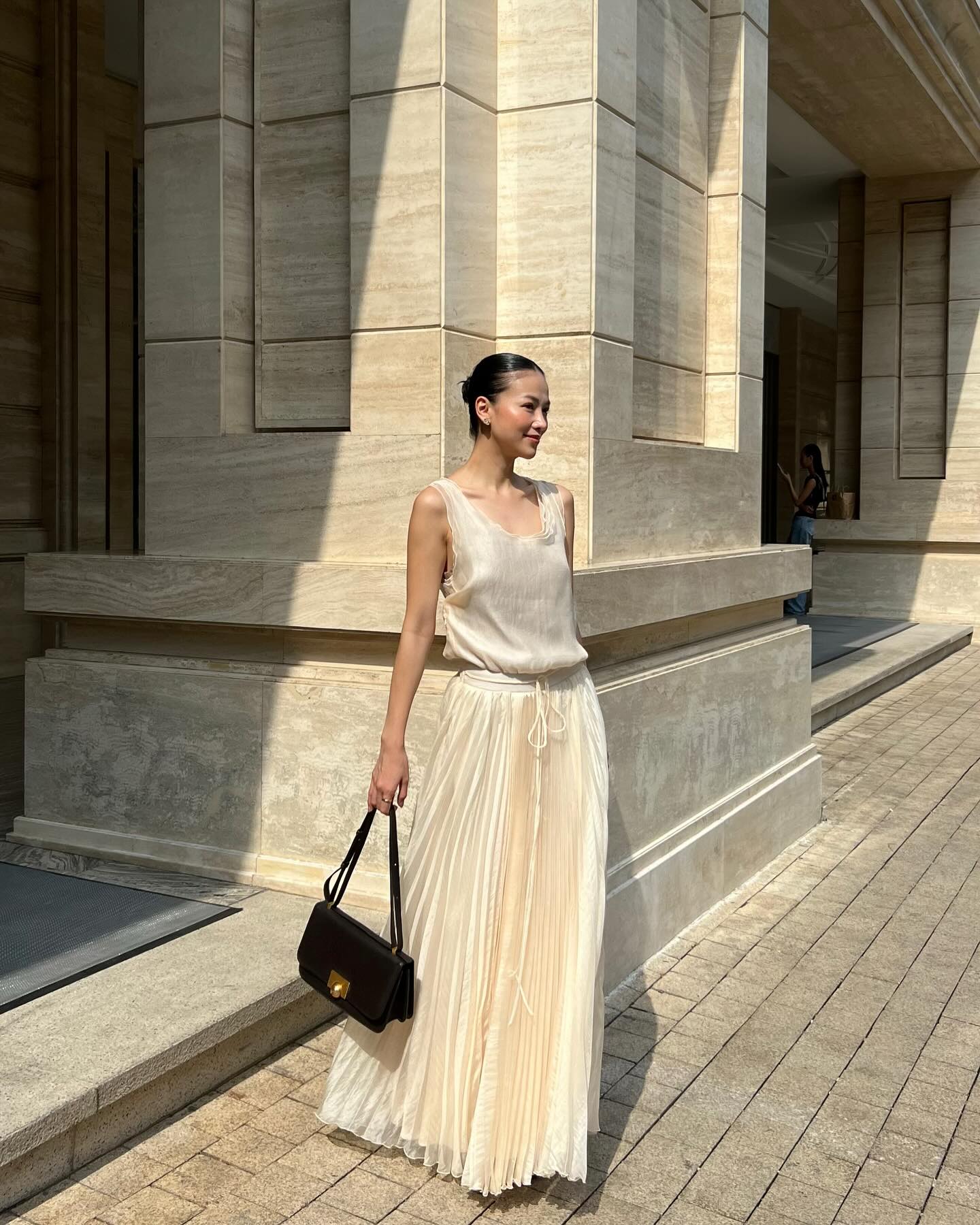 Chân váy trắng là món đồ không thể thiếu với những mỹ nhân theo đuổi phong cách nữ tính, thanh lịch. Từ chân váy chữ A, chân váy xếp ly cho đến chân váy midi dáng dài, sắc trắng luôn mang lại cảm giác nhẹ nhàng, tinh khôi. Đây cũng là item thường xuyên xuất hiện trong những bức ảnh street style hay du lịch của các sao nữ Việt.