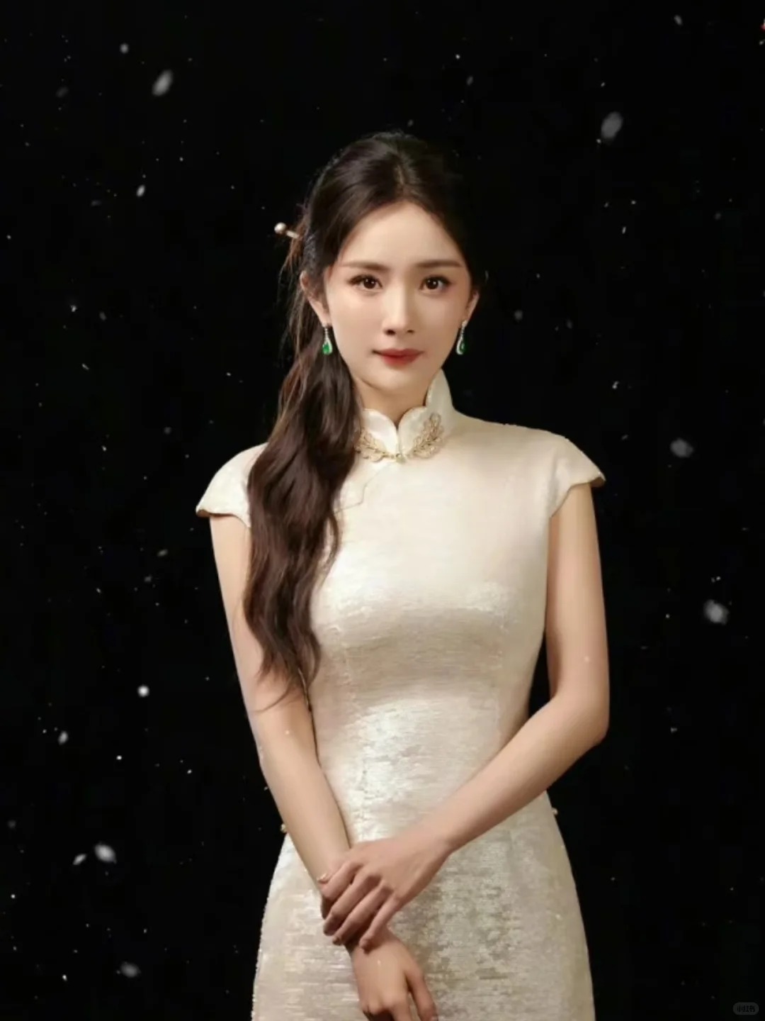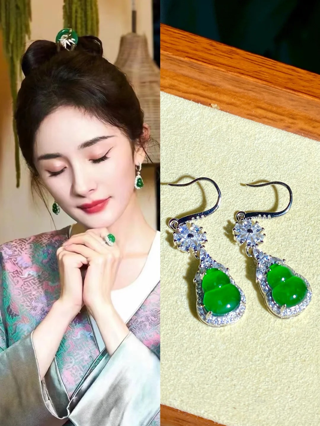 Ai bảo đeo ngọc là cổ hủ, là mang "vibe" của các vị phu nhân lớn tuổi? Đôi khuyên tai ngọc phỉ thúy dáng hồ lô mà Dương Mịch lăng xê nhiệt tình dạo gần đây đã tạo nên một cơn sốt thực sự, định nghĩa lại hoàn toàn khái niệm trang sức Tân Trung Hoa. Từng viên ngọc hồ lô được mài giũa tròn trịa, căng mọng, dưới ánh sáng tự nhiên trông lung linh hệt như những giọt sương đọng trên phiến lá biếc. Mỗi bước đi là một nhịp đung đưa rạng rỡ, lập tức làm bừng sáng góc nghiêng thần thánh của người diện.