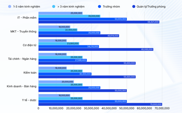Đặc biệt, ở cấp quản lý/trưởng phòng, ngành Y tế - Dược đạt mức lương trung vị 70 triệu đồng/tháng, cao nhất trong tất cả các ngành được khảo sát, vượt IT - Phần mềm (khoảng 68,4 triệu đồng) và Cơ điện tử (65 triệu đồng).
