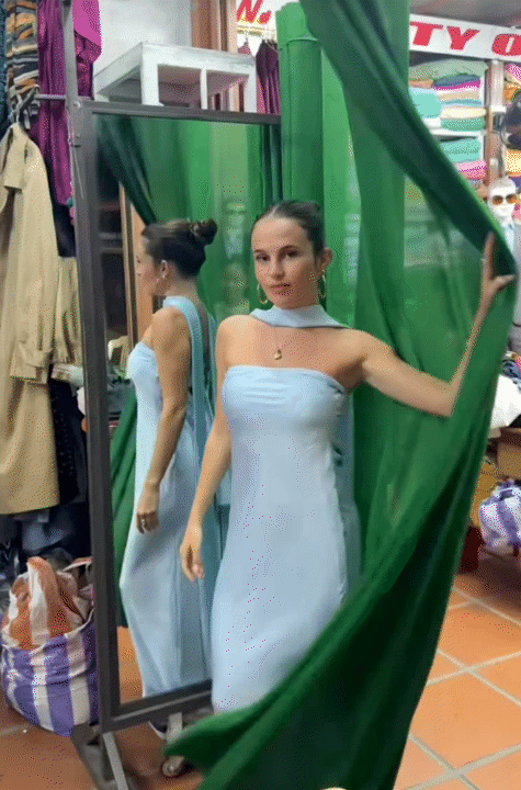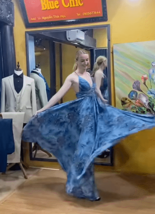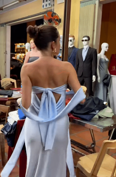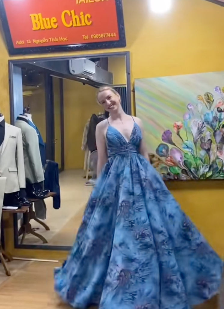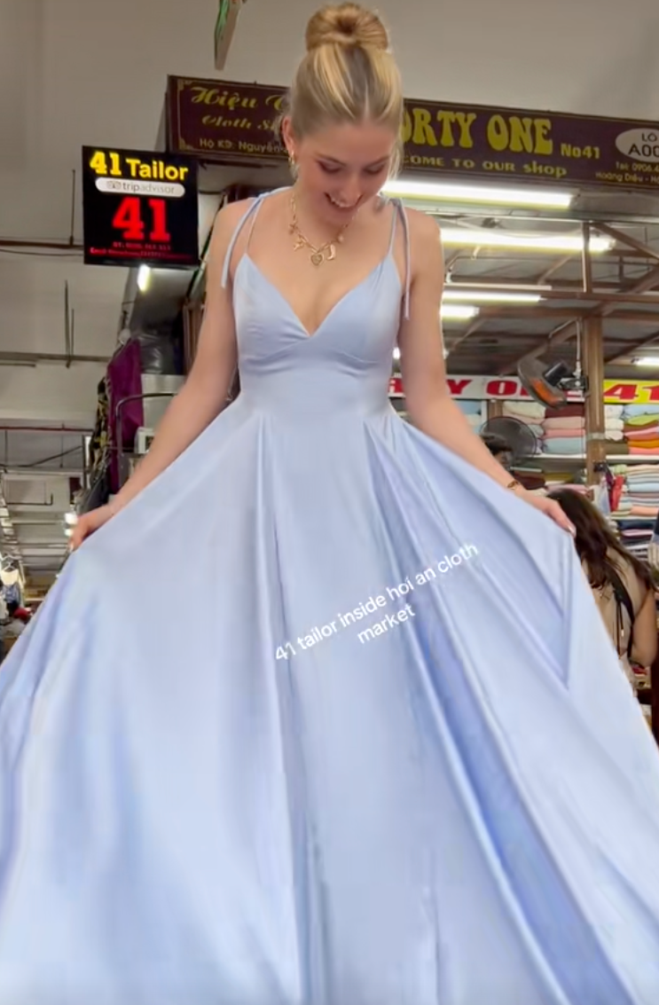 Cô nàng Evie đặt may một bộ đầm lụa gợi cảm với gam màu xanh baby. Thiết kế đầm cup ngực có thêm dải lụa mềm mại để tạo hiệu ứng thướt tha cho thiết kế. Không thể ngờ đây là một bộ đầm được một nhà may ở Hội An cắt may chỉ khoảng hơn 1 ngày là xong. (Nguồn: @evie)