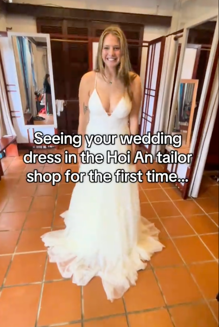 Rất nhiều cặp đôi đã đến Hội An để may váy cưới, vest cưới cho ngày trọng đại của mình. Đa phần các cô dâu sẽ chọn những kiểu dáng chữ A nhẹ nhàng, ôm lấy vóc dáng của cô dâu. (Nguồn: @blueeyetailor)