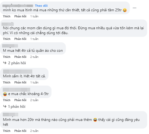 Các thành viên bên nhóm độc thân cảm thấy "toát mồ hôi" sau khi biết chi phí đón con chào đời thật sự không nhỏ. Nhiều chị em còn nhấn mạnh chi phí chuẩn bị đón bé như thế này cũng là bình thường. Đối với những gia đình lựa chọn sản phẩm cao cấp hơn thì chi phí còn đội lên nhiều hơn. Ngoài ra, một số mẹ thì chia sẻ họ không biết chuẩn bị hết bao nhiêu vì có quá nhiều khoản lặt vặt không tính nổi nhưng tiền thì cứ đi đâu mất.