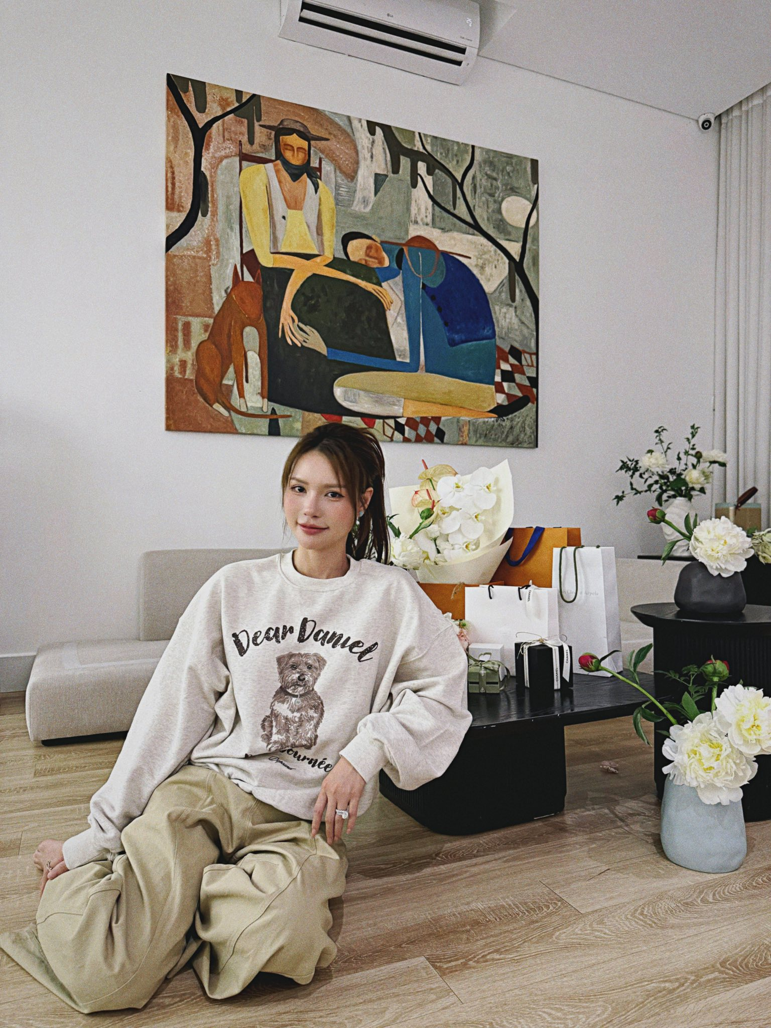 Ngày 20/10 năm ngoái, chồng cô - Tuấn Dương, đã từng chi gần 400 triệu đồng để tặng vợ bộ trang sức xa xỉ kết hợp vườn hoa hướng dương vô cùng rực rỡ. Mẹ bỉm Lucie Nguyễn còn chia sẻ thêm chiếc vòng trị giá hơn 300 triệu đồng và đôi bông tai 90 triệu đồng là món quà mà Tuấn Dương tặng 2 mẹ con.