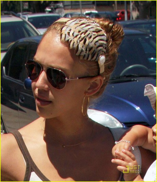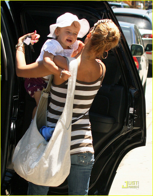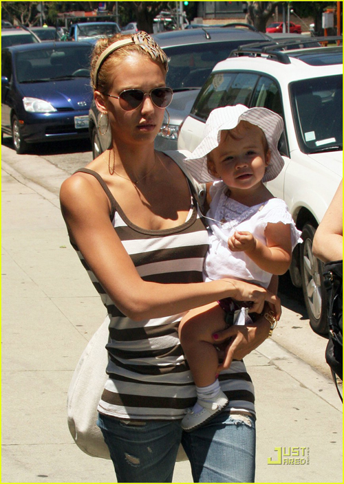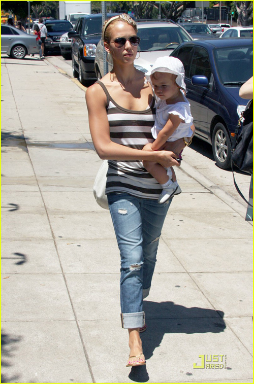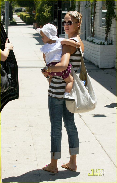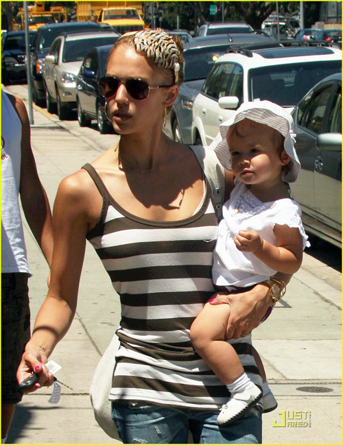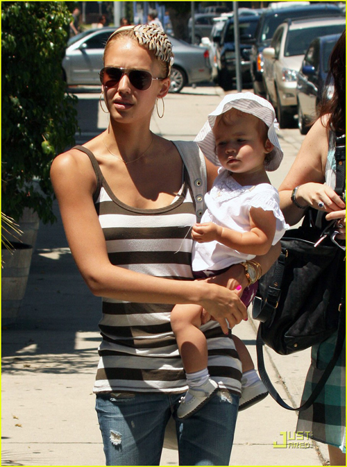 Jessica Alba bế con gái Honor 13 tháng tuổi đi dạo chơi và mua đồ lặt vặt. Cô bé Honor thích thú cười tươi còn bà mẹ xinh đẹp thì trông nổi bật với chiếc bờm lông chim độc đáo.