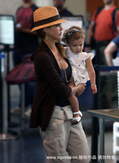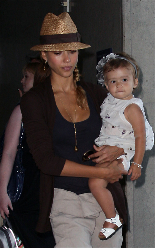 Jessica Alba với làn da nâu khỏe mạnh, thân hình gợi cảm và phong cách ăn mặc cá tính riêng bước nhanh trên phố. Tay bế cô con gái bé bỏng Honor mặc chiếc váy trắng điệu đàng, không quên kèm theo một chiếc bờm hoa trên mái tóc ngắn. Bà mẹ mê con này đã bắt đầu trở lại với điện ảnh với những hợp đồng đóng phim gần nhà để không phải xa bé Honor quá lâu.