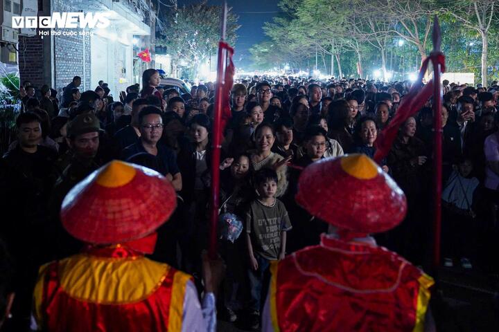 Ngay từ tối, khu vực cổng chợ đã ken đặc người dân chờ đợi. Phía trước lối vào, 4 lính nghi trượng trong trang phục truyền thống túc trực, giữ gìn an ninh trật tự cho phiên chợ.