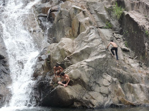 Men theo lối mòn lên những bậc đá cao khoảng 100m, bắt gặp thác Gieo hùng vĩ sủi bọt, đổ nước ầm ầm xuống tầng thác thấp hơn, tràn qua những phiến đá phẳng mòn và tiếp tục trút ào ạt xuống ao sâu với làn nước xanh vắt.