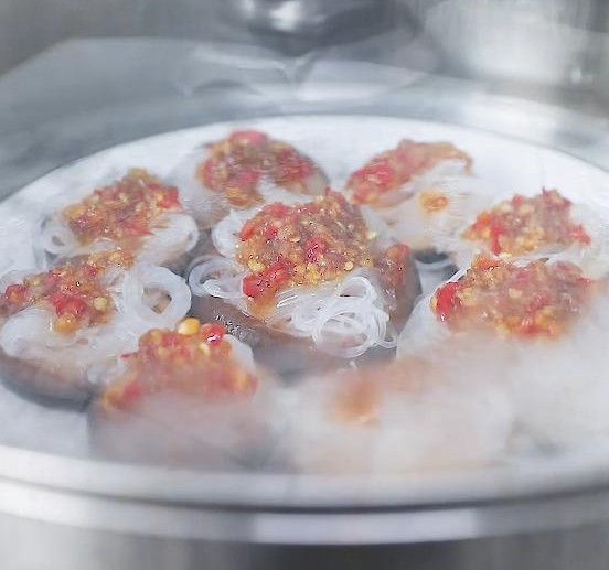 - Cho phần miến dong còn lại vào giữa đĩa còn trống, rồi rưới nước sốt tỏi và một ít nước ngâm nấm hương lên trên. Sau khi hoàn thành, bạn đặt đĩa nguyên liệu vào xửng hấp. Tiếp theo cho nước vào nồi hấp, đun sôi rồi hấp món ăn trong khoảng 10-12 phút.
