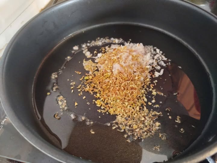 - Băm nhỏ tỏi (không quá nhuyễn để giữ lại độ giòn), và thái ớt thành khoanh. Đặt chảo lên bếp, đun nóng cùng dầu ăn. Sau đó cho 1/2 lượng tỏi băm vào, xào trên lửa nhỏ đến khi thấy chuyển sang màu vàng nhạt. Tắt bếp, rồi ngay lập tức cho phần tỏi băm còn lại và ớt băm nhỏ vào, dùng nhiệt dư để xào.