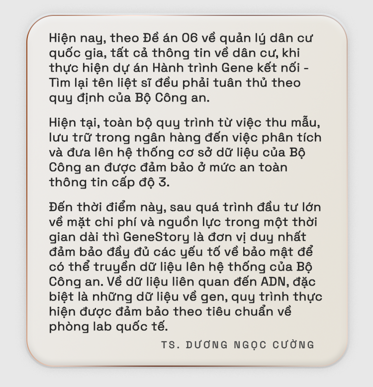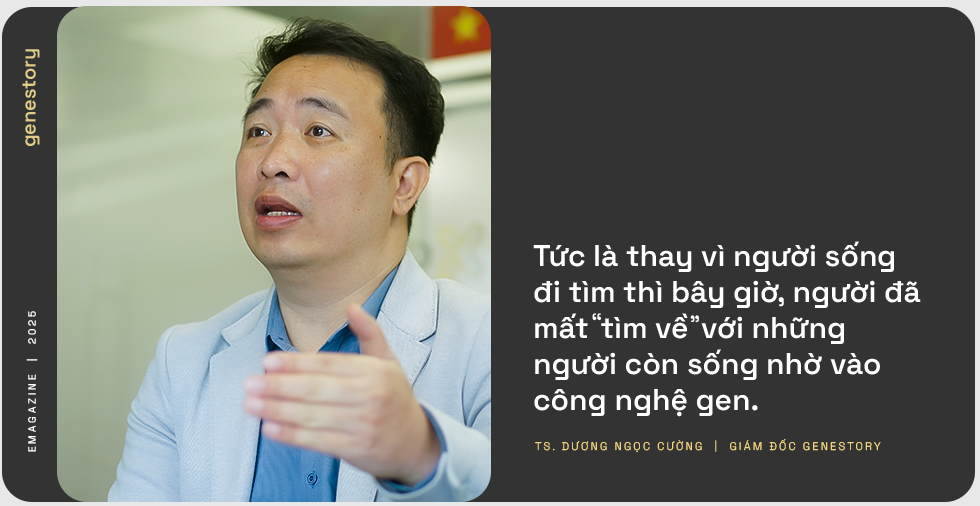 Chính vì thế, chúng tôi nghĩ rằng tất cả phải cùng chung tay vào làm được một Ngân hàng Gen của thân nhân - là những người đang còn sống có thể thu được mẫu, có thể xác định được ngay để lưu trữ lại mẫu gen. Sau đó, trong quá trình tìm kiếm, thu thập hài cốt, ta có thể dùng những mẫu ADN từ hài cốt đối sánh lại với thông tin của nhân thân thì hiệu quả hơn rất nhiều. Tức là thay vì người sống đi tìm thì bây giờ, người đã mất tìm về với những người còn sống nhờ vào công nghệ gen.