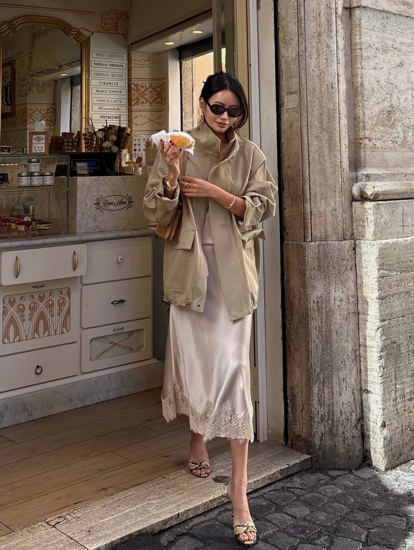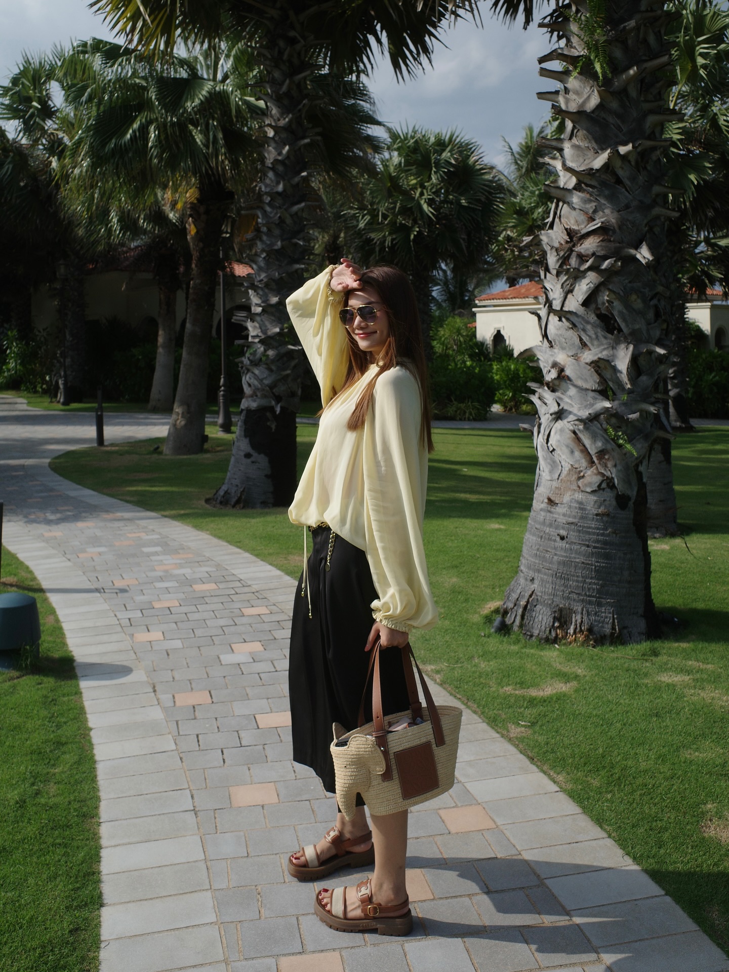 Điều quan trọng khi mặc chân váy lụa là sự tiết chế. Không cần quá nhiều phụ kiện hay họa tiết cầu kỳ, chỉ cần giữ tổng thể gọn gàng và tinh giản, bạn đã đủ nổi bật với vẻ đẹp nhẹ nhàng, trưởng thành.